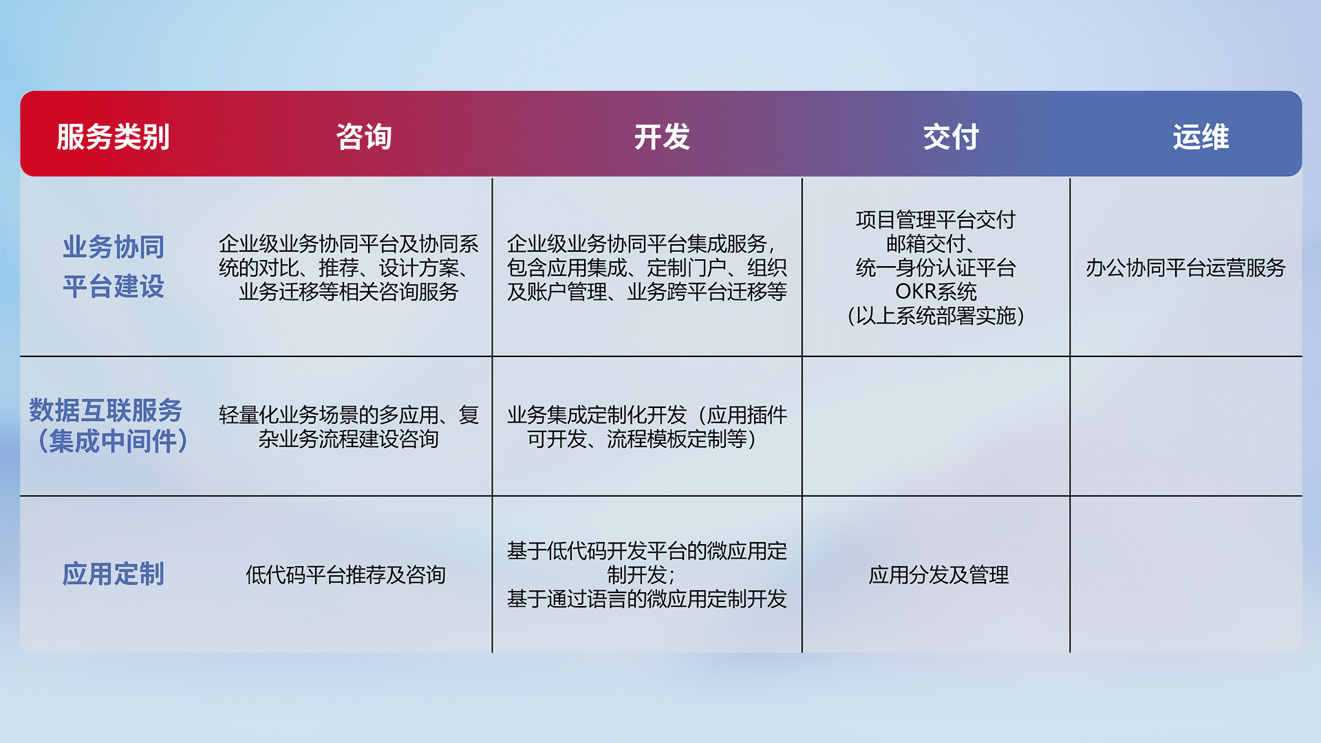 针对钉钉、、企微、、IDaas等平台级产品提供产品的规划、、方案、、交付、、定制化开发等服务,,实现如统一协同办公、、、、智能客户服务、、混合会议管理、、、智能数据查询、、、、等业务场景,,实现数字化转型。。。